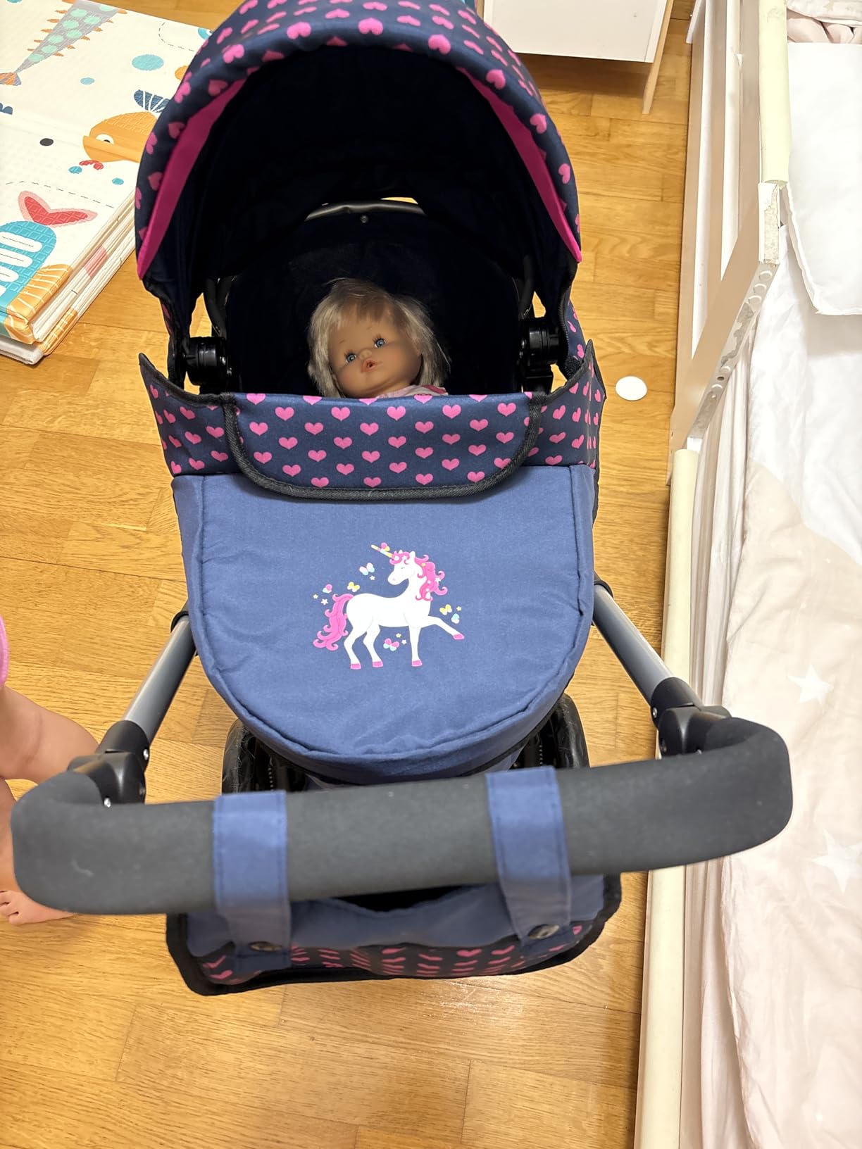 Precioso!!! Un carrito de muñecas súper bonito Su montaje es fácil El manillar es regulable en altura, genial para poderlo usar durante más tiempo Los colores muy bonitos Las ruedas se ven de buena calidad Viene con un bolsita a juego para colgar en el manillar o llevar en el hombro ideal para meter cosas de los muñecos Miu bien empaquetado en su caja original y forrado con bolsitas de plástico para evitar que se estropee Trae una bandeja abajo para poder poner cositas Es prácticamente igual que uno de un bebé de verdad Muy fácil de manejar, el sistema para hacerlo silla es genial Por poner un pero debería venir a parte de con el embalaje original con algo q lo tape, ya que la caja trae la imagen del cochecito y si es para un regalo se ve en cuanto recoges el paquete Muy recomendado