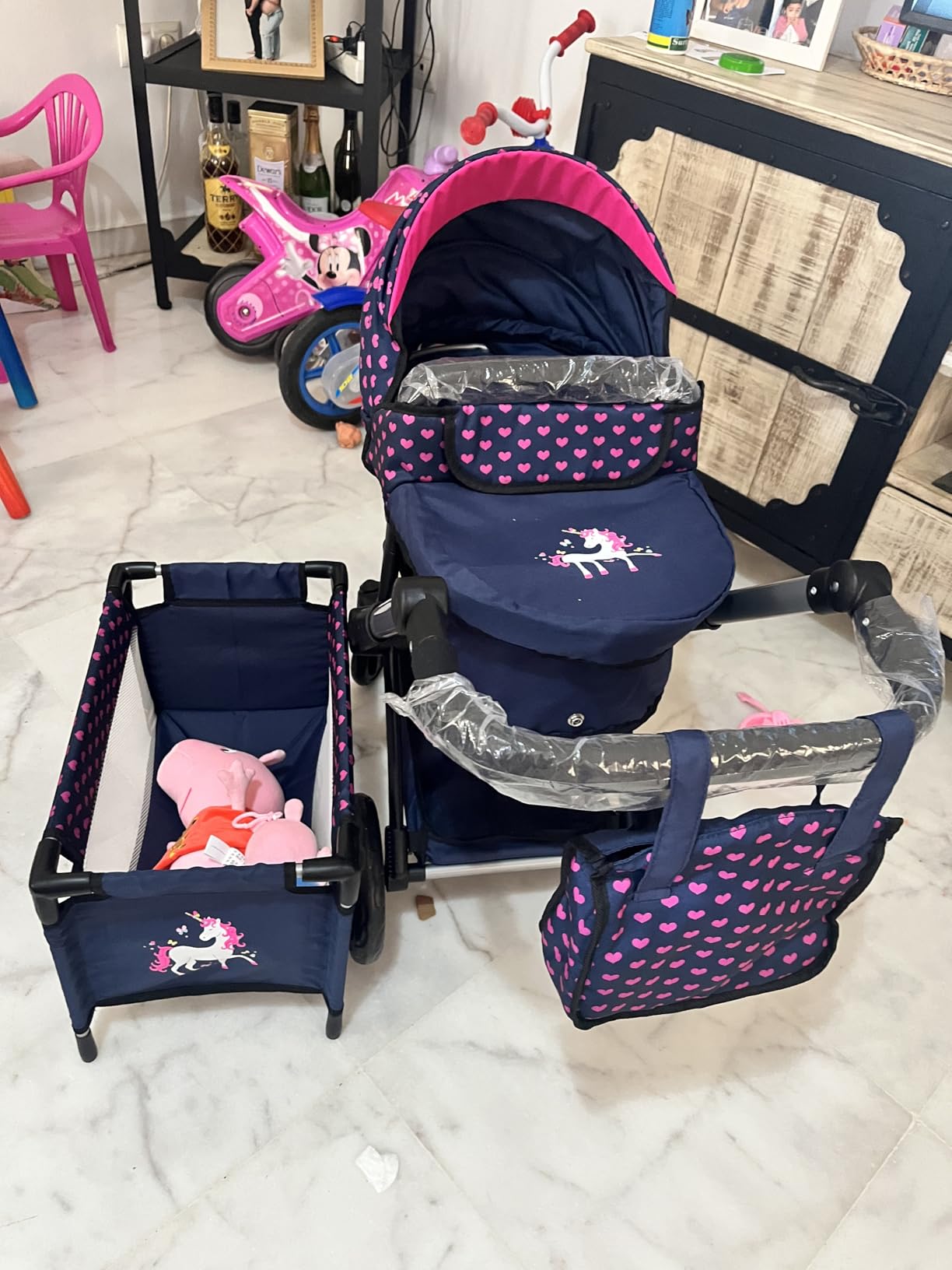 Buena relación calidad-precio! Mi hija de 6 años esta encantada! Es muy bonito y el fucionamiento es igual que un carrito de bebé de verdad, es decir, puedes girar e capazo, convertilo en silla de paseo, etc. Sin duda lo recomiendo